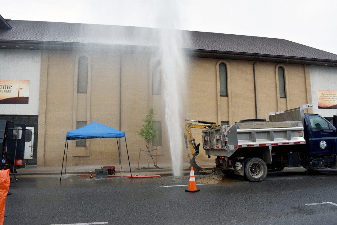 East Church Street could have been nicknamed “Water Street” on Thursday morning when a geyser of water shot up high into the sky from a main break near its intersection with Grove Street. Water from the break rushed down the street into the nearest storm drains. Motorists slowed their vehicles as they traveled by a section of the street where four city public works employees were searching for the proper shut off valve. Crews said they were fixing a water leak when the line burst.